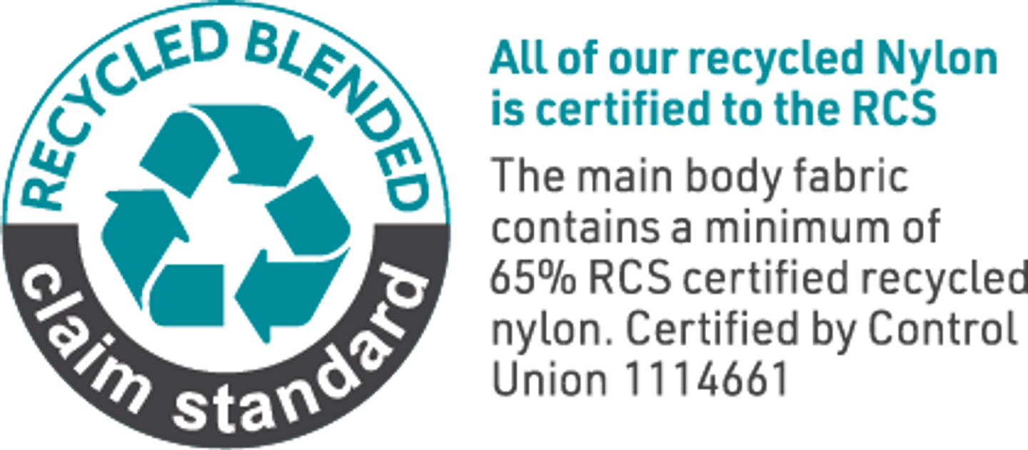 Our nylon is independently certified to the Recycled Claim Standard (RCS). The main body fabric contains a minimum of 65% RCS certified recycled nylon content, independently certified to the Recycled Claim Standard (RCS).